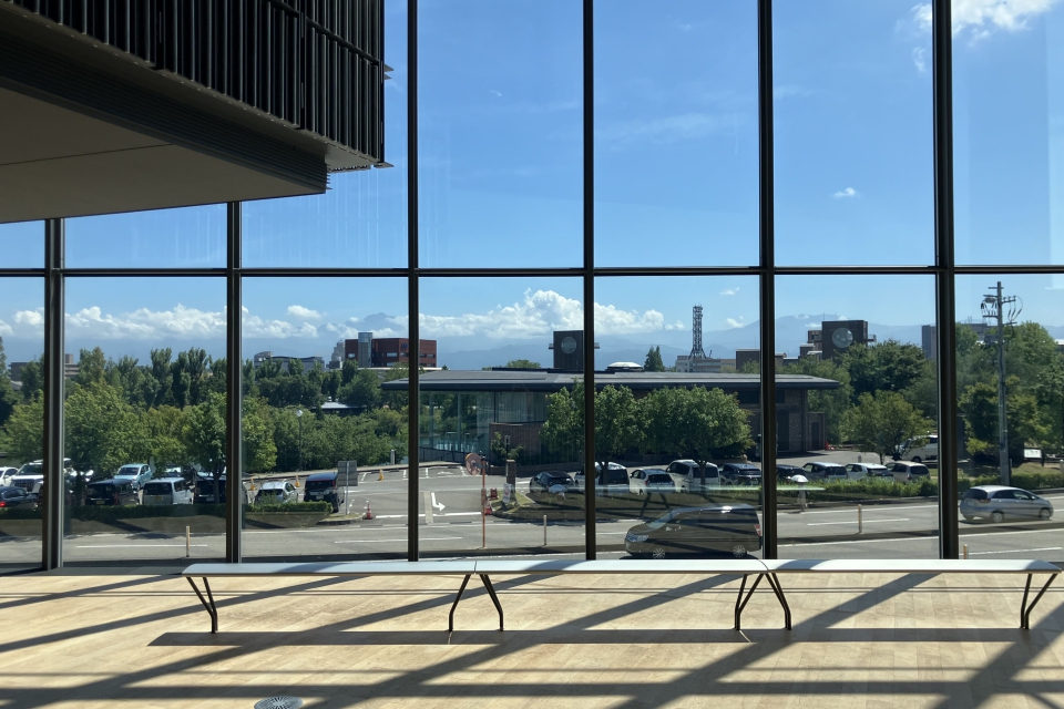 ガラスファサードは立山連峰の眺望に対しスパっと切断された面とすることで大きな視点での周辺との関係、風景とのつながりを重視しいることが特徴です。