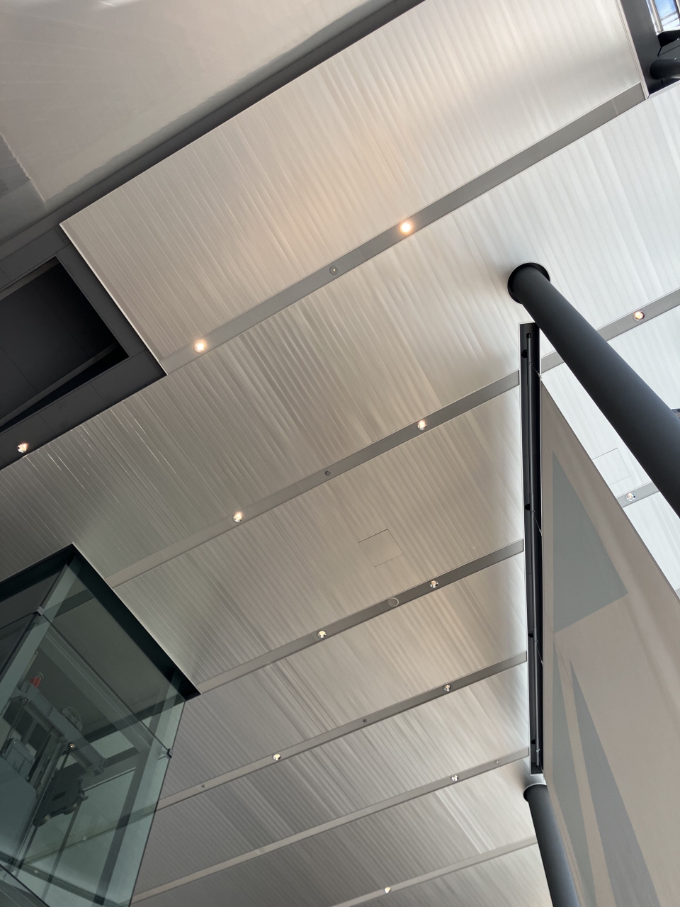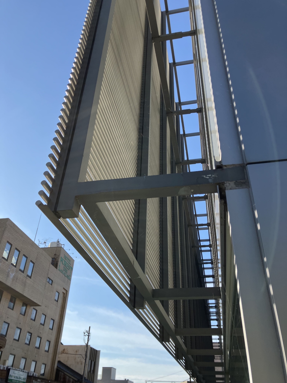 すだれ状のアルミルーバーが繊細で美しいのですが、下地もきれいでビスやボルトの頭が見えないのがすごいです。
