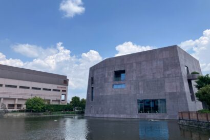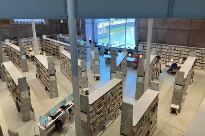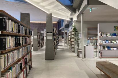 ため池の中に浮かぶ巨大な岩のような図書館です。土木的な力強さを感じる外観は町の中に異物として存在しながら、不思議と違和感は無く、ユニークなオブジェとして受け入れられているといった雰囲気でした。内部に踏み込むと開放的な空間が広がっています。デザインされた書架がランダムに散らされていることで、視線や動線がアクロバティックに交差し、複雑かつ豊かな空間を作り出していました。コンクリートの分厚い壁が内部にも侵食しており、一貫してこの建物の素材感(あるいは意思)を感じることができます。