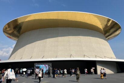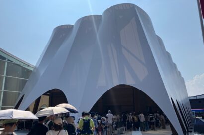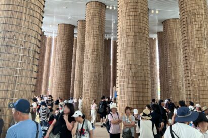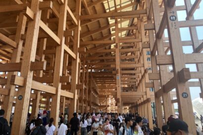 中々パビリオンに入れず、空いているパビリオンを探して木造リングの下を歩き続けました。殺人的な酷暑の中、予約が取れないスマホとにらめっこをしながらパビリオンを狙い続ける自身の姿がガラスに映っており、「いのちの輝き」について考えさせられました。個性的で、きらびやかで、活気があって、各国の威信を示すパビリオンはピカピカと輝いていますが、その体験は一部の幸運な人に限られます。一歩引いて見ればそういってパビリオンとは対象的に木造リングは全ての人を包みこんでいます。疲れた人々はその日影で休んでおり、皮肉的にサブテーマの「いのちを救う」「いのちに力を与える」「いのちをつなぐ」を実感しました。入れたパビリオンは僅かでしたが、世界的な一大イベントを目と肌で感じることができました。