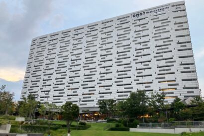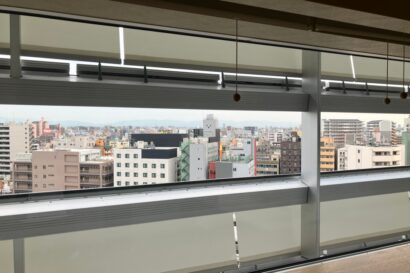 アルミ形材と膜素材による外装が特徴のホテルです。白い膜は日射負荷の軽減を行いながら、夜には光を映し出すスクリーンとしての役割を担い、近接するJR駅に向かう顔の役割を果たします。夜になるとこのスクリーンに花火のような照明が賑やかに映し出され、敷地が過去に持っていたネガティブなイメージを払拭することに奮闘しているようでした。