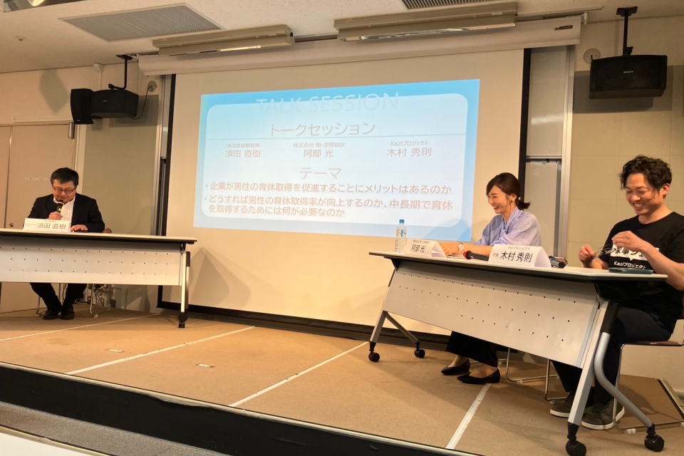 また、トークセッションでは、社会保険労務士の須田直樹先生、Kaziプロジェクト代表の木村秀則様とともに、育児休業に対するそれぞれの想いや課題意識について率直に意見を交わしました。