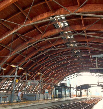 大屋根はスパン38.5m、長さ60mのハイブリッド構造で、ダイナミックで開放的な空間をつくり出している。