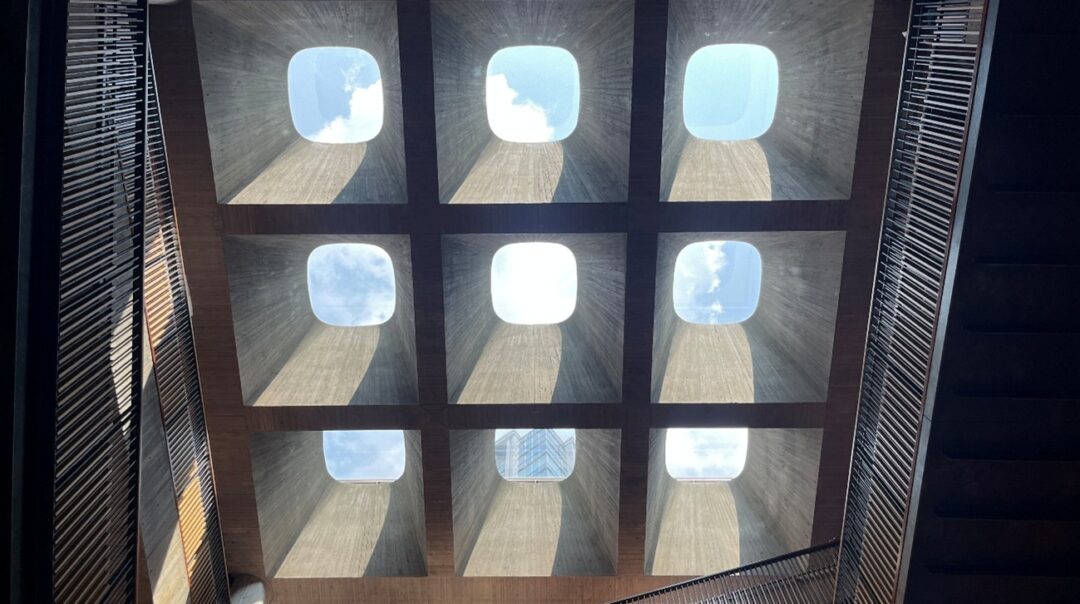 見る角度によってさまざまな表情を見せる建築で、構造美と素材の魅力が調和した印象的な作品だった。