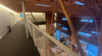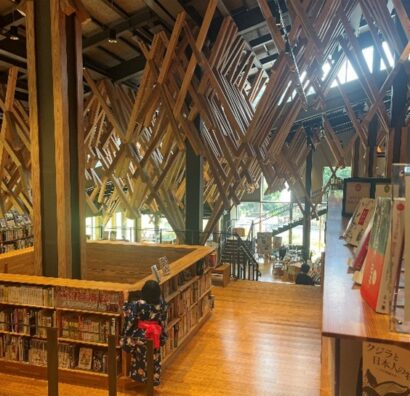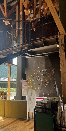 ガラス張りの1階部分からは柔らかな光が差し込み、まるで森の中の木漏れ日のような印象を受けた。開放的で自由な空間構成となっており、館内では子どもたちがのびのびと動き回る姿が見られた。ボルダリングスペースも設けられており、図書館でありながら身体を動かすアクティビティも可能な構成となっている。