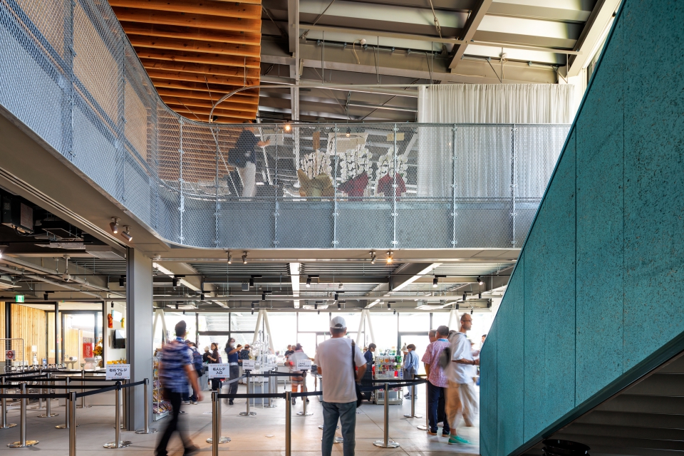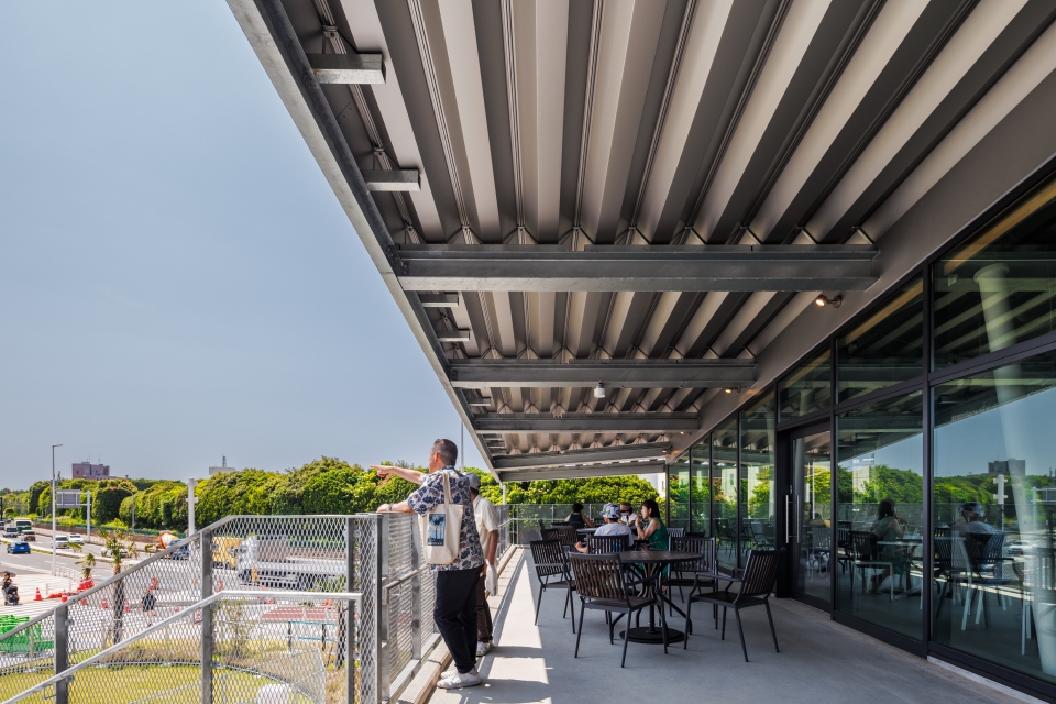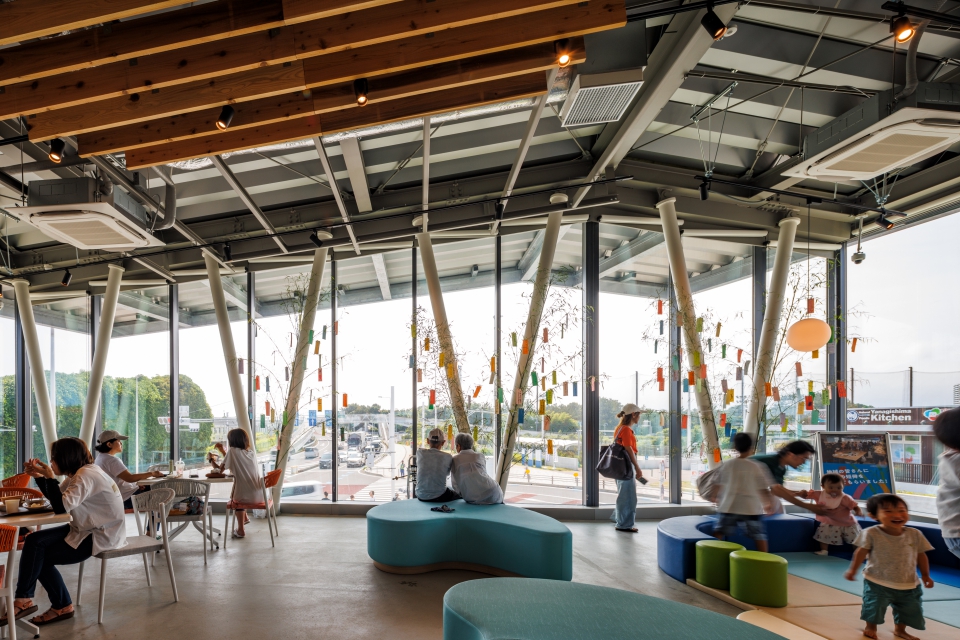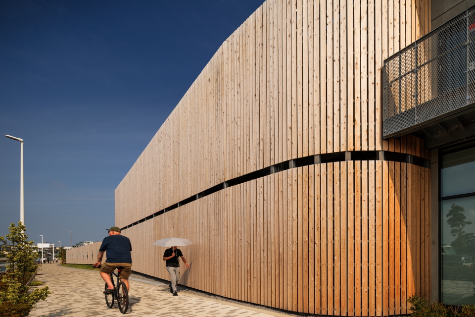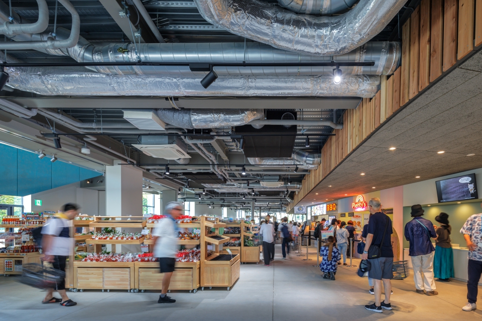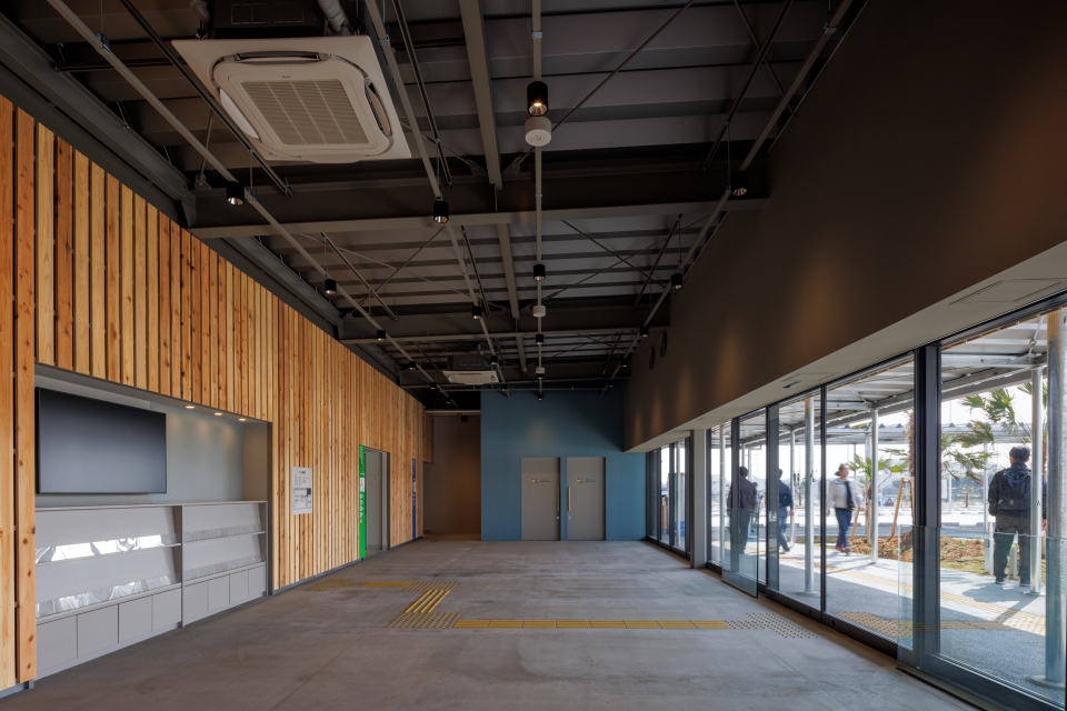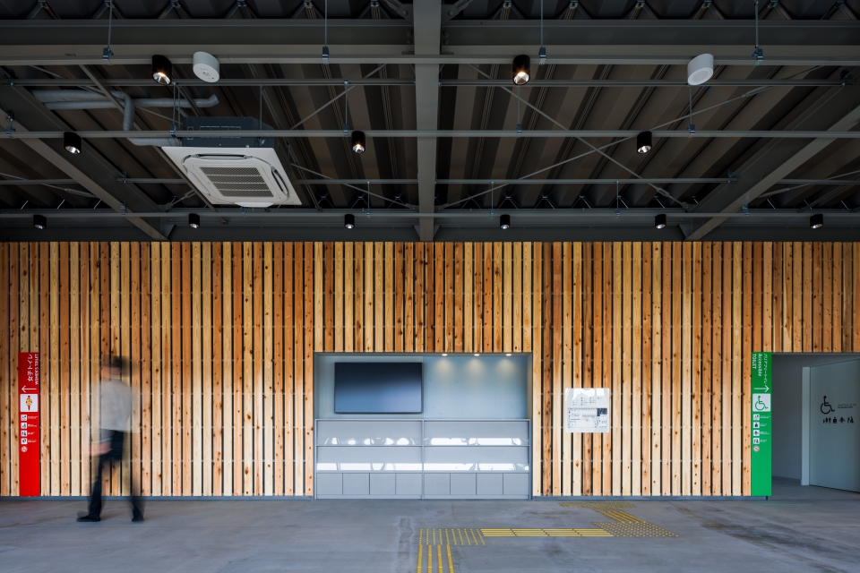 設計コンセプトである、「地域のブランドシンボルとなる、ゲートウェイとしての道の駅」を体現するべく、国道側や交流広場側にはガラスを多用し、外部への賑わい創出を実現しました。一方、鉄砲道沿いには内外に連続する木ルーバーを配置し、設備・搬入エリアの目隠しをしつつ、「鉄砲道ギャラリー」として地域住民へ向けたギャラリー空間としました。敷地形状に沿うように各機能を配置することで、それぞれの属性に応じて表情が変わる計画としています。