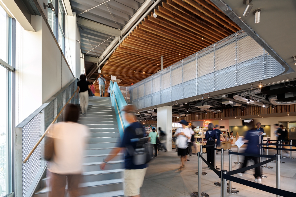 全体のデザイン計画として、内外部に連続する木ルーバーは「海辺の木柵」、2階天井の木ルーバーは「大きなサーフボード」、雁行させたガラスファサードは「海のきらめき」、青い階段は「湘南のビッグウェーブ」、サーフボード型の案内サインや植栽計画など、各所に「茅ヶ崎らしい」デザインを散りばめました。