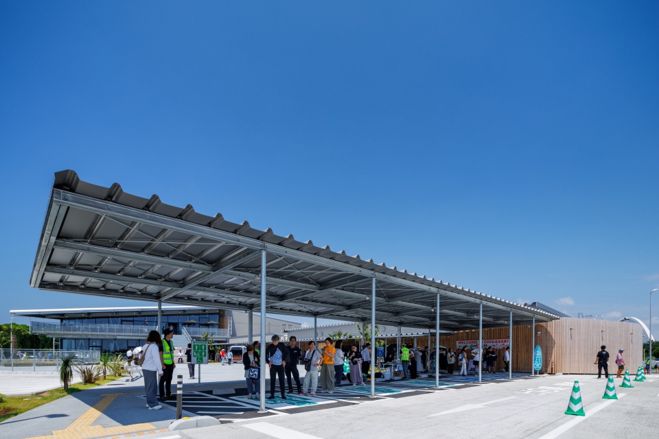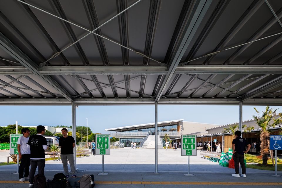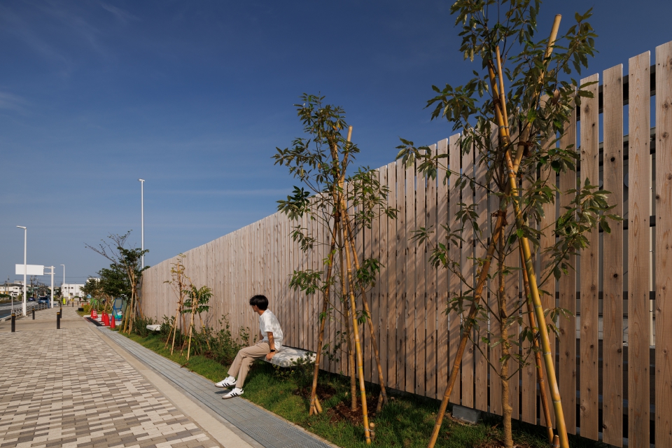 外構は湘南・茅ヶ崎の象徴である海をモチーフに、敷地全体や駐車場を「海」に見立て、道の駅を「船」、植栽帯を「島」、安全な歩行空間を「桟橋」としてデザインしています。